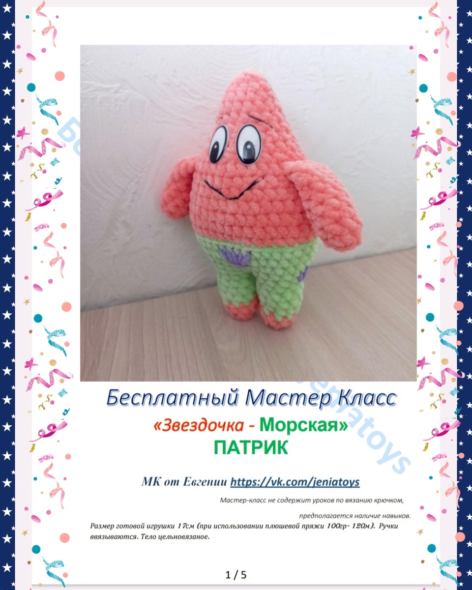 Бесплатный мастер класс "ПАТРИК", спанч боб.- https://vk.com/mkjeniatoys?w=wall-219277394_4959