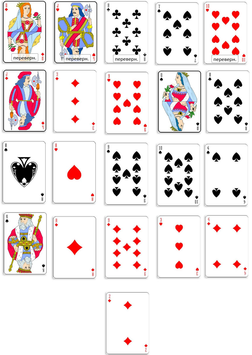 «Ой, - говорит девушка –моя бывшая подруга (Дама Бубен перевернутая) решила мне напакостить и стала распространять слух, что мой парень - очень ненадежная личность и бросил меня в очень интересном положении (Валет Червей перевернутый). А вскоре об этом стали болтать все наши друзья (Восьмерка Треф перевернутая). Хмм, да, так и есть, не зря я рассталась с Оксаной из-за ее длинного языка. И несмотря на то, что я отчаянно защищалась и говорила, что это ложь (Семерка Пик), весть распространилась с невероятной скоростью и дошла до моих родственников (Десятка Кубков перевернутая)»
