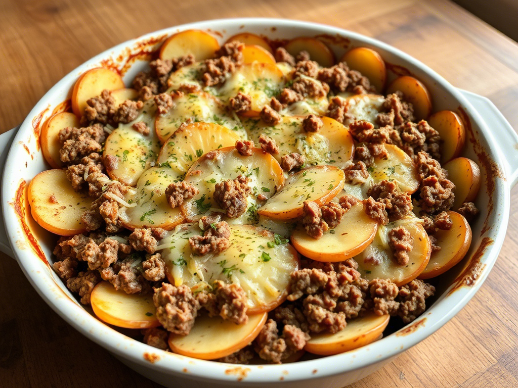 - Сборка: В форму для запекания выложите половину картофельного пюре, сверху распределите фарш, затем оставшееся пюре. Разровняйте поверхность.