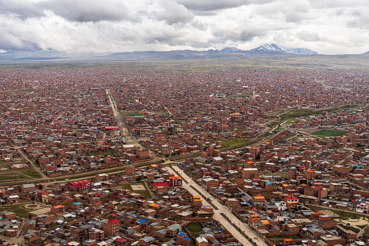 Пока-пока, Титикака, надеюсь, ещё встретимся, а наше январское путешествие по Латинской Америке погружается вглубь Боливии. Направление — Ла-Пас. Это второй по величине город (если без пригородов) и де-факто столица государства, хотя де-юре столицей является Сукре. Вот такая неразбериха у них здесь. Но рассказ будет совсем не про административное деление Боливии, а о гораздо более необычных материях — здесь кое-где показывают весьма любопытные картинки. Но обо всём по порядку. Одним из пригородов Ла-Паса является населённое образование Эль-Альто. Если смотреть на карту, то размеры этого «пригорода» превышают размер самого Ла-Паса, а население его вроде бы уже больше миллиона человек. Если учесть, что Эль-Альто расположен на высоте более 4тыс.м, то это самый высокогорный город-миллионник. Из самолёта этот населённый пункт выглядит как-то не вполне презентабельно: Если присмотреться — да, совершенно очевидно, что здесь не самый высокий уровень доходов на душу населения. Можно, конечно, б