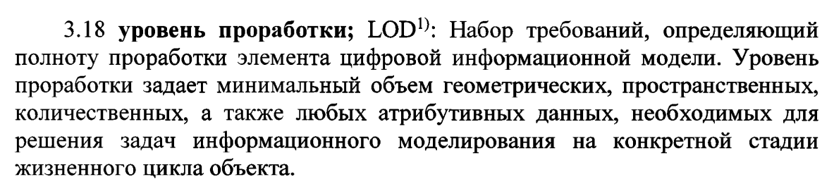 На данный момент в нормативной базе РФ термин LOD не закреплен и уровни LOD тоже. Ранее в СП 333.1325800.2017 (заменен на СП 333.1325800.2020) было следующее определение уровня проработки: