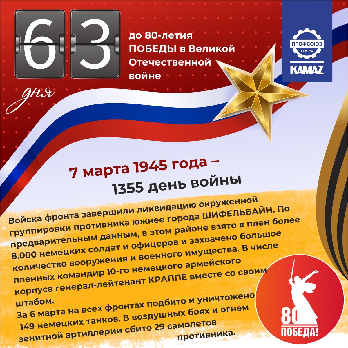 Войска 2-го БЕЛОРУССКОГО фронта 7 марта с боем овладели городами ГНЕВ (МЕВЕ), СТАРОГАРД (ПРЕЙСИШ СТАРГАРД) — важными опорными пунктами обороны немцев на подступах к ДАНЦИГУ, а также с боями заняли более 200 других населенных пунктов, среди которых крупные населенные пункты ЗААБЕН, ПИНШИН, ГОХ ШТЮБЛЯУ, КОШМИН, ЛОГУТКЕН, ЛИНЕВО, ОЛЬПУХ, ДЗИМЯНЕН, ЗОММИН, РЕКОВ, ЛУББЕН, ТРЕБЛИН, БАРТИН, ЦОЛЛБРЮК, АЛЬТ-БЕВЕРСДОРФ, АЛЬТ-ШЛАВИН, ДАМСХАГЕН, НОЙВАССЕР. Войска 1-го БЕЛОРУССКОГО фронта, продолжая наступление, 7 марта штурмом овладели городами ГОЛЛНОВ, ШТЕПЕНИТЦ и МАССОВ — важными опорными пунктами обороны немцев на подступах к ШТЕТТИНУ, а также с боями заняли более 50 других населенных пунктов и среди них ВАЛЬДДИВЕНОВ, ФРИТЦОВ, ЯССОВ, ЛААТЦИГ, ЗАГЕР, ПАУЛЬСДОРФ, ШЮЦЕНДОРФ, АМАЛИЕНХОФ. Войска фронта завершили ликвидацию окруженной группировки противника южнее города ШИФЕЛЬБАЙН. По предварительным данным, в этом районе взято в плен более 8.000 немецких солдат и офицеров и захвачено большое количес