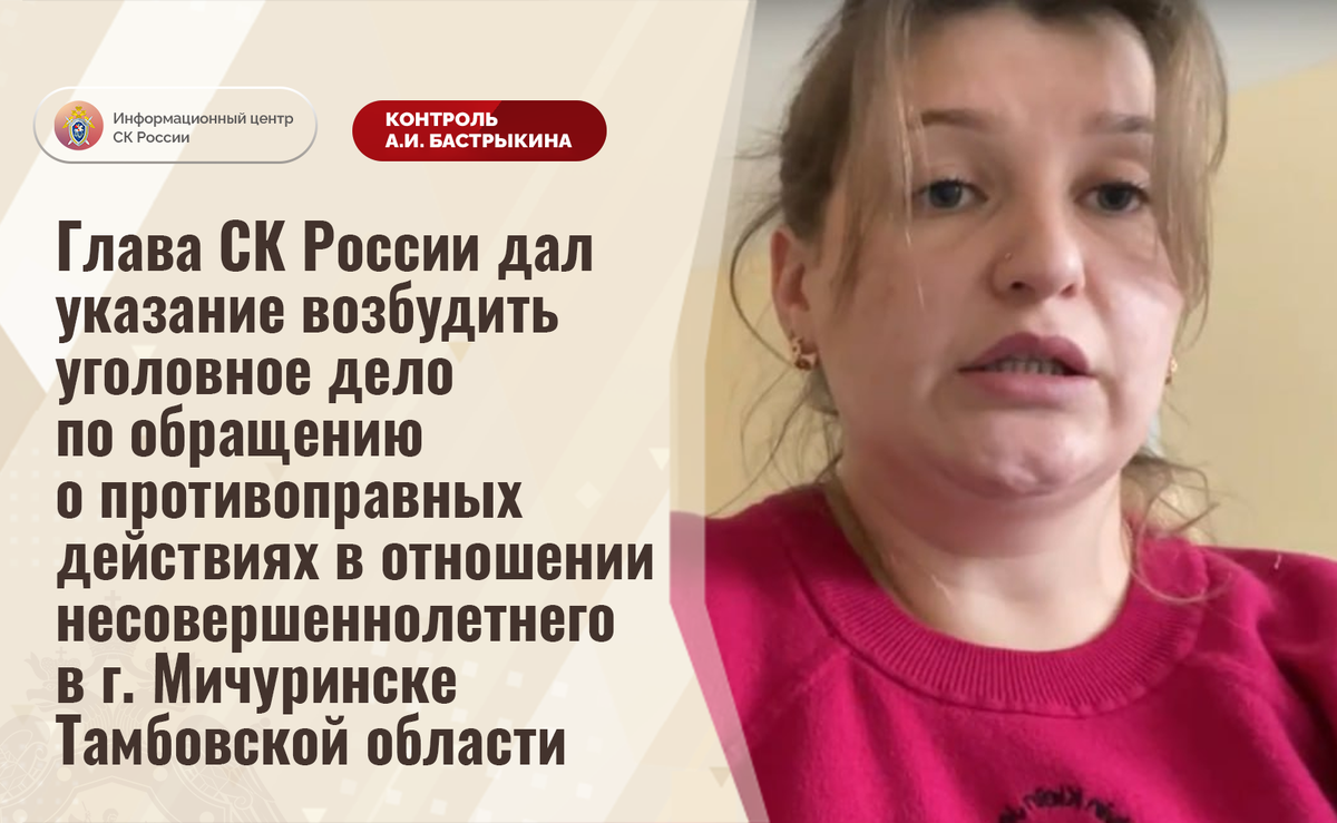 Глава СК России дал указание возбудить уголовное дело по обращению о противоправных действиях в отношении несовершеннолетнего в г. Мичуринске Тамбовской области В комментариях в аккаунте приемной Председателя СК России А.И. Бастрыкина «ВКонтакте» размещено видеообращение жительницы города Мичуринска Тамбовской области. Она выражает несогласие с ходом установления обстоятельств совершения противоправных действий в отношении ее несовершеннолетнего сына. В январе текущего года знакомый мальчика, находившийся в состоянии алкогольного опьянения, облил пострадавшего бензином, после чего поджёг его. Ребенок госпитализирован с ожогами, ему требуется длительное стационарное лечение. Многочисленные обращения в компетентные органы результатов не принесли. В СУ СК России по Тамбовской области проводится процессуальная проверка. Председатель Следственного комитета Российской Федерации Александр Иванович Бастрыкин дал указание руководителю СУ СК России по Тамбовской области Александру Николаевичу По