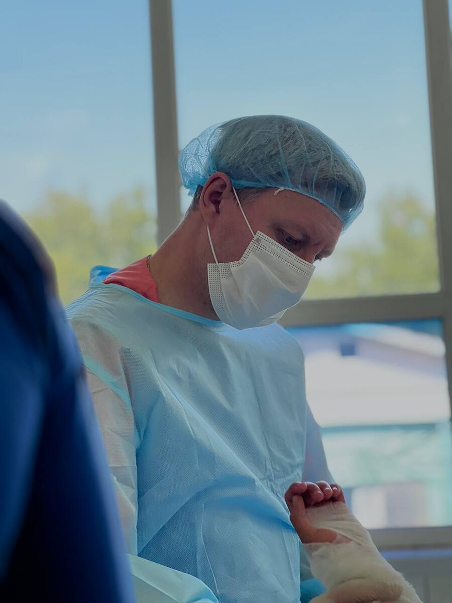 💬 «Данный вид перелома — одна из наиболее тяжёлых травм локтевого сустава и нередко влечет за собой потерю функций верхней конечности. Под наркозом мы восстановили правильную анатомию внутрисуставных структур плечевой кости и зафиксировали отломки спицами», — прокомментировал заведующий отделением Куваев Виталий Анатольевич.