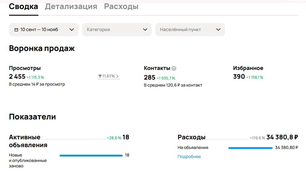 Недавно собрал данные за период с 10 сентября по 10 ноября, которые показали весьма интересные результаты. По данным скриншота, за указанный период у нас зафиксировано 2 455 просмотров объявлений, что является колоссальным скачком на 1115,3% по сравнению с предыдущими периодами. Это означает, что жильцы Иваново все чаще ищут услуги строительных компаний именно на этой платформе. Средняя стоимость просмотра составила всего 14 рублей, что делает инвестиции в продвижение более выгодными. Контактов было обнаружено 285, что приводит к рекордному росту на 935,7%. Это выражает живой интерес потребителей к нашим предложениям. Каждый контакт на данный момент обходился нам в 120,6 рублей, что вполне разумно для строительной ниши, где сфера услуг требует значительных затрат. Всего 390 раз наши объявления были добавлены в избранное, что позволяет предположить, что пользователи не просто просматривают, но и активно заинтересованы. Расходы на рекламу составили 34 380,8 рублей, увеличившись на 119,6