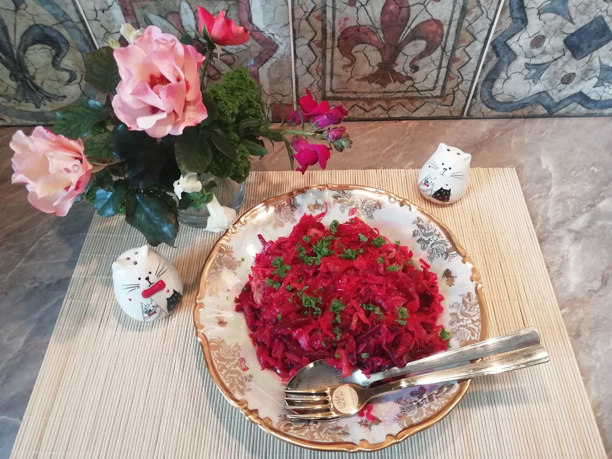 Я очень люблю тушёную капусту. Готовлю ее и с копченостями, и с грибами. Могу ее есть и в горячем, и в холодном виде. И как гарнир, и как начинку для пирожков, и как самостоятельное блюдо. Сегодня захотелось ярких красок, поэтому приготовлю-ка я тушёную капусту со свеклой. Времени на приготовление потребуется около часа, плюс время на отваривание или запекание свеклы. Свеклу я решила запечь, завернула ее в фольгу и отправила на часок в духовку, разогретую до 210°С. Затем свеклу остудила и натерла на крупной тёрке. Лук порезала полукольцами, обжарила на растительном масле, добавила свеклу, томатный соус и «мармелад». Протушила все вместе 10 минут. Промыла слегка капусту под проточной водой (этого можно и не делать, ориентируйтесь на свой вкус). И потушила ее на другой сковороде, через 30 минут добавила свеклу с луком. Все аккуратно перемешала и на медленном огне прогрела капусту еще 10 минут. Пробую на вкус и добавляю немного сахара, не солю, т.к. моя капуста достаточно соленая. Можно с