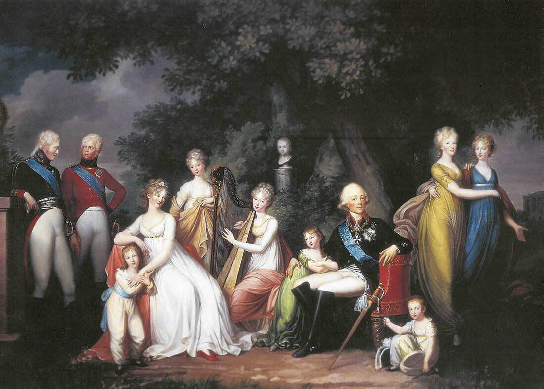 Итак, после потери первой жены, которая умерла в родах вместе с ребенком, и не слишком долгого вдовства наследник престола, единственный законный сын Екатерины II и Петра III, правнук Петра I, великий князь Павел Петрович женился во второй раз, негоже наследнику престола ходить неустроенным вдовцом, ПОЛОЖЕНИЕ ОБЯЗЫВАЕТ. На это раз брак оказался и удачным, и относительно счастливым. Об этом мы можем судить по тому, что вторая жена, немецкая принцесса София-Мария-Доротея-Августа-Луиза Вюртембергская, принявшая православие и ставшая после свадьбы великой княгиней Марией Федоровной, родила мужу десятерых детей. На известной картине художника Франца Герхарда фон Кюгельгена изображено все семейство. Присутствует даже Ольга, умершая в младенческом возрасте. Ее милую головку мы видим на заднем плане картины. Итак, начнем по порядку, по старшинству.