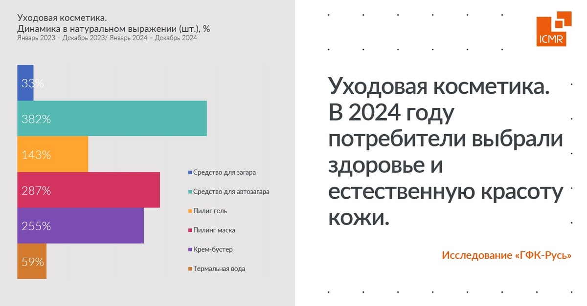 Потребительские предпочтения на рынке косметики меняются по объективным и субъективным причинам. Чтобы выбрать верное направление развитие бизнеса, важно понять, чего хотят покупатели. Милина Дьякова, консультант потребительской панели ICMR (ООО "ГФК-Русь"), рассказывает про сложившиеся в 2024 году тренды в уходовой и декоративной косметике. Согласно панельному исследованию ICMR (ООО "ГФК-Русь"), в 2024 году потребители держали курс на здоровье и естественную красоту кожи, предпочитая отказываться от избытка декоративной косметики. Это отражается в росте спроса на определенные категории уходовых средств. Давайте посмотрим, какие именно: Не смотря на общий тренд – отказ от избытка декоративной косметики, в отдельных категориях наблюдается значительный рост. Интересно, что в 2024 году в центре внимания оказались средства для бровей и губ. Тенденции 2024 года четко демонстрируют стремление потребителей к здоровой, ухоженной и естественной красоте. Уход за кожей выходит на первый план, но