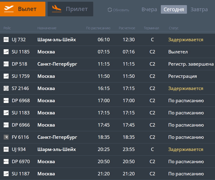 В местной воздушной гавани в ожиданиях томятся желающие улететь на отдых в теплую страну. Причина — 6-часовая задержка рейса UJ 732 авиакомпании AlMasria Universal Airlines. Судя по табло аэропорта, вылет был запланирован в 06:10, однако самолет еще даже не приземлился в Гумраке. Воздушное судно должно было прибыть в 9 часов утра, но по неизвестным причинам его прилет перенесли на 11:20. Из-за этого волгоградцы смогут вылететь в Египет лишь в 12:30. Аналогичная ситуация ожидается и с вылетом, назначенным на 20:35. В Волгограде самолет должен был приземлиться в 19:05, но расчетное время прилета назначили на 22:40. Так что тем, кто в преддверии 8 Марта собрался в отпуск в теплую страну, придется задержаться в Волгограде. Стоит отметить, что сегодня ожидается задержка еще одного рейса. Самолет авиакомпании S7 Airlines