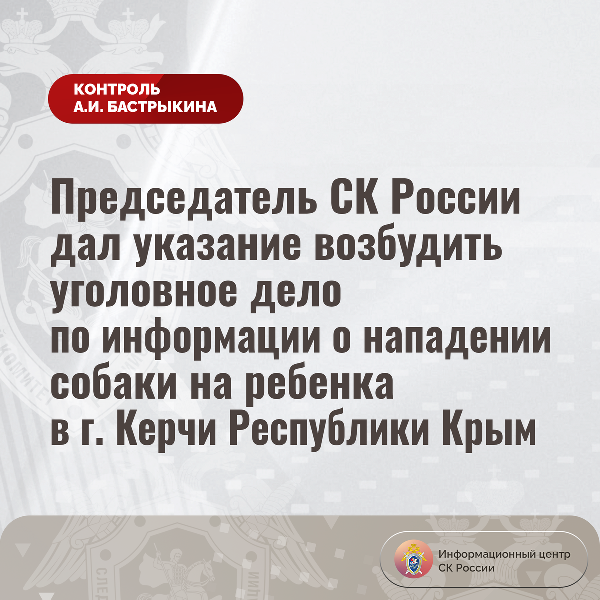 Председатель СК России дал указание возбудить уголовное дело по информации о нападении собаки на ребенка в г. Керчи Республики Крым В СМИ и социальной сети сообщается, что 5 марта текущего года в городе Керчи Республики Крым агрессивное животное набросилось на семилетнего мальчика во дворе многоквартирного дома, укусив его за ногу. Отмечается, что собака, возможно, принадлежит местному жителю, который выпускает своих животных на самовыгул. При этом стая регулярно нападает на граждан, однако меры реагирования не принимаются. В ГСУ СК России по Республике Крым и городу Севастополю по данному факту организована процессуальная проверка. Председатель Следственного комитета Российской Федерации Александр Иванович Бастрыкин дал указание руководителю ГСУ СК России по Республике Крым и городу Севастополю Владимиру Николаевичу Терентьеву возбудить уголовное дело и представить доклад о ходе и результатах его расследования. Исполнение поручения поставлено на контроль в центральном аппарате ведомст