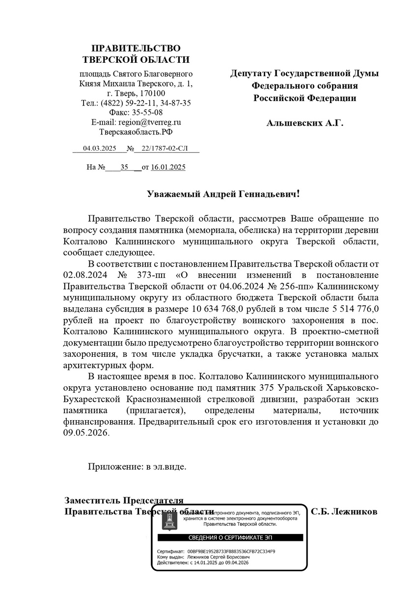 В декабре 1941-го в окрестностях Калинина (нынешняя Тверь) погибли наши земляки-свердловчане из 375-й стрелковой дивизии, которая формировалась именно на Среднем Урале. В 2021, 2022 годах поисковики из Свердловской, Тверской и Московских областей подняли останки более 300 красноармейцев. Часть имен смогли установить и даже найти родственников. В октябре 2022-го защитников Отечества с воинскими почестями перезахоронили в деревне Колталово. Однако на повестке остался ключевой вопрос со строительством памятника и благоустройством территории… Для меня было делом принципа направить свои ходатайства губернатору Игорю Рудене. И в свежем ответе получил то самое долгожданное подтверждение: эскиз готов, определены материалы и, что главное, источник финансирования. Установят (предварительно) к 9 мая 2026 года.