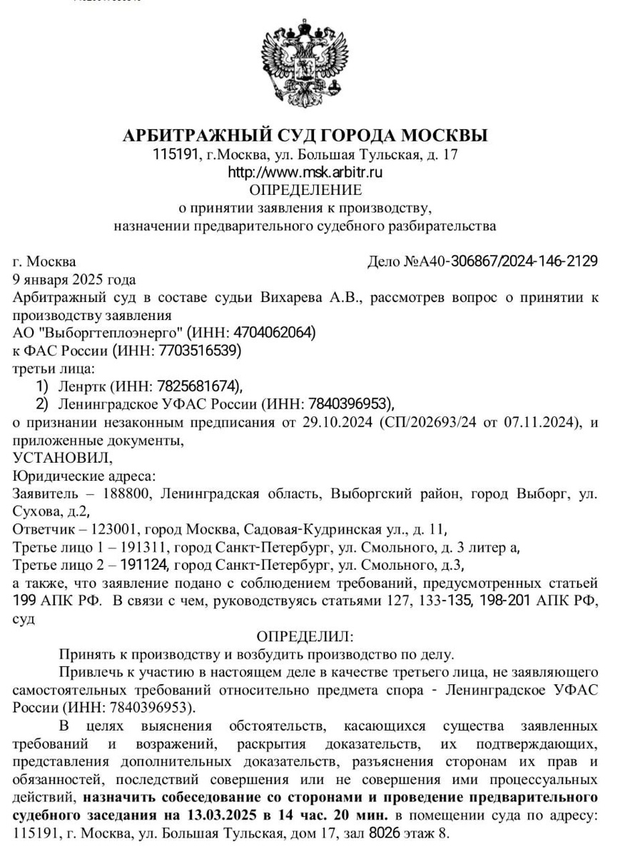 13 марта в Москве пройдёт суд между Выборгтеплоэнерго и Федеральной антимонопольной службой (ФАС). Цена иска - более 100 млн.руб. Это часть тех денег которые Выборгтипоэнерго увеличил жителям Выборгского района по мошеннеческим схемам.