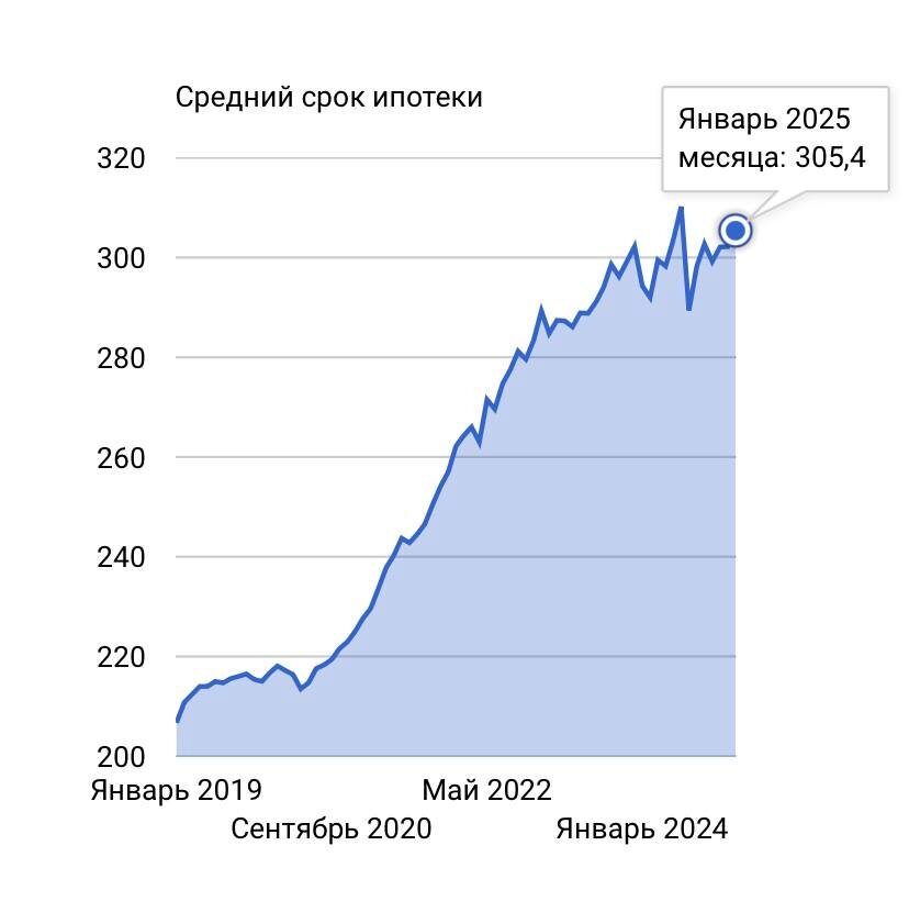 Средний срок ипотечного кредита по новым договорам в январе 2025 года достиг 305,4 месяца.