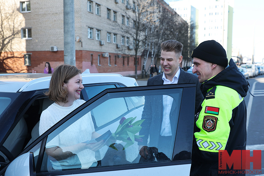 Актив Московского районного комитета БРСМ совместно с представителями ОГАИ Московского РУВД устроил поздравительную акцию для женщин-водителей накануне 8 Марта, передает корреспондент агентства «Минск-Новости». Локацию у здания в переулке Домашевском мужчины выбрали неслучайно. Здесь всегда большой поток машин, а ближе к концу рабочего дня — особенно. Вооружившись цветами, инспектор ГАИ и молодые люди стали вглядываться в проезжающие мимо авто в поисках милых дам. Спустя пару минут остановилась первая машина. Водитель Светлана была сосредоточена на дороге, явно думая о чем-то серьезном. Но, едва к машине подошли герои праздника и вручили ей цветы с сувенирами, на лице Светланы тут же возникла сияющая улыбка. — Сегодня и так очень хороший день, а тут вдруг внезапно. Спасибо огромное! Я, наверное, скажу, что это лучший подарок, потому что он самый неожиданный. Настоящий сюрприз! — не скрывала эмоций Светлана. Не прошло и пяти минут после отъезда первого автомобиля, как инспектор останови