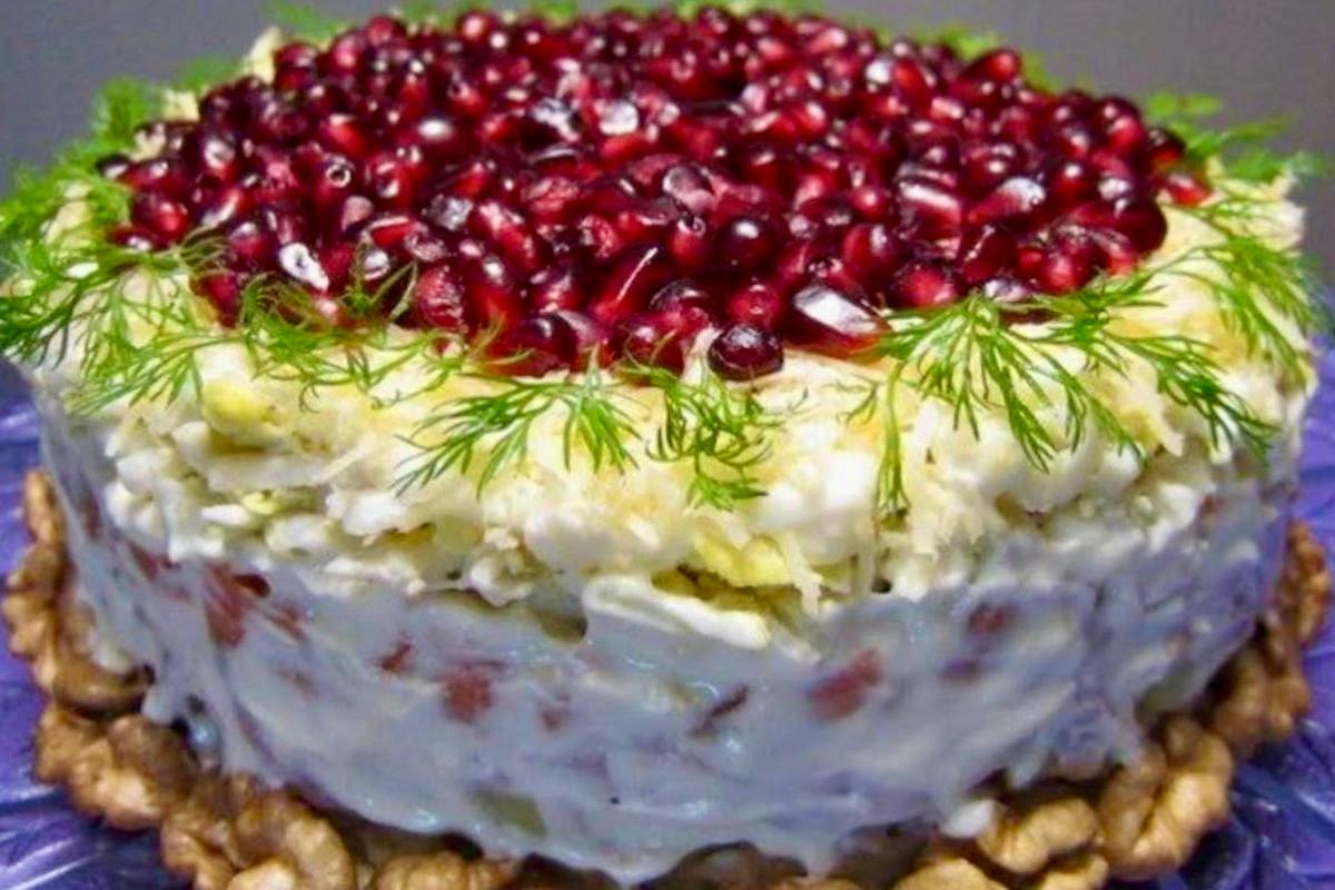 грецких орехов, сыра и граната создаёт необычный баланс вкусов, а слоистая структура делает его сытным и нежным.