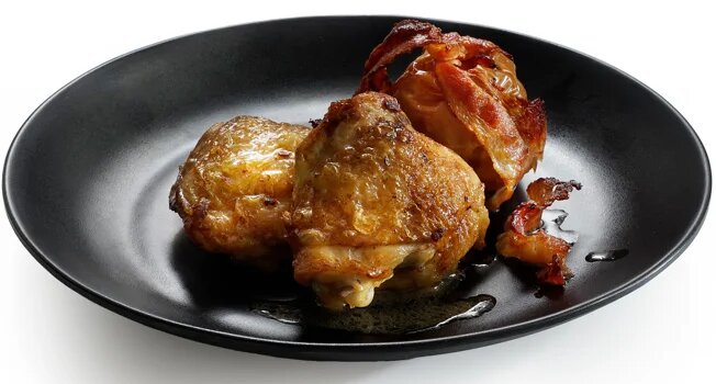 Обещание того, что каждая семья сможет позволить себе курицу на столе в праздничный день, легло в основу не одной предвыборной программы в истории человечества. Но давайте обещания политиков рассматривать отдельно, а куриные бедрышки — отдельно. Так вот, правильно приготовленные куриные бедрышки — это хрустящая корочка и сочное мясо, блюдо недорогое, компанейское и при этом имеющее неограниченный праздничный потенциал. Особенно если взять к ним в компаньоны кислые крепкие яблоки: в этом рецепте при запекании яблоки млеют и тают, пропитываются елочным запахом майорана и подкопченным жиром бекона и в результате превращаются в ароматное полупюре и становятся одним из самых интересным соусов, которые к курице в принципе можно придумать. Остается добавить какой-нибудь нейтральный по вкусу, но не слишком обыденный гарнир вроде кускуса, булгура или риса басмати, и у вас появятся десятки вариаций одного и того же безотказно нарядного блюда. Подготовьте все ингредиенты. На 6 порций вам понадо