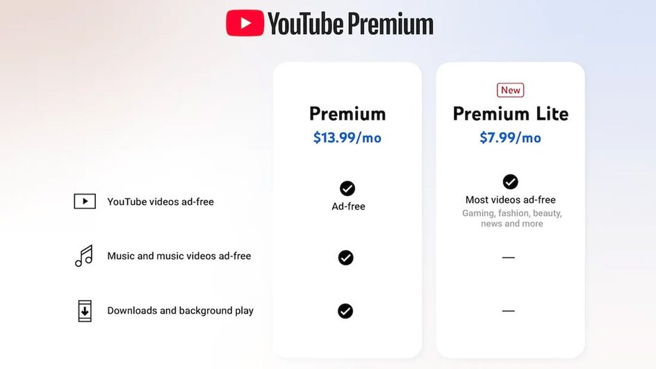 YouTube запустил доступную подписку Premium Lite: в 2 раза дешевле обычной