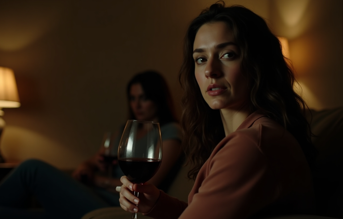 Марина сидела на диване, крутя бокал в руках, наблюдая, как красное вино оставляет тонкие следы на стекле.