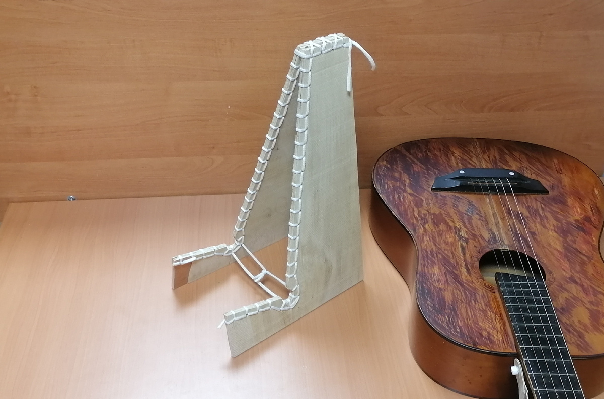 На досуге сделал подставку для гитары из подручных средств. Материалы: фанера и верёвка. Инструмент: электролобзик и дрель. На фото что получилось. Может кому пригодится. Мои поделки: https://dzen.ru/id/679c72620d120b0ce90a96c6