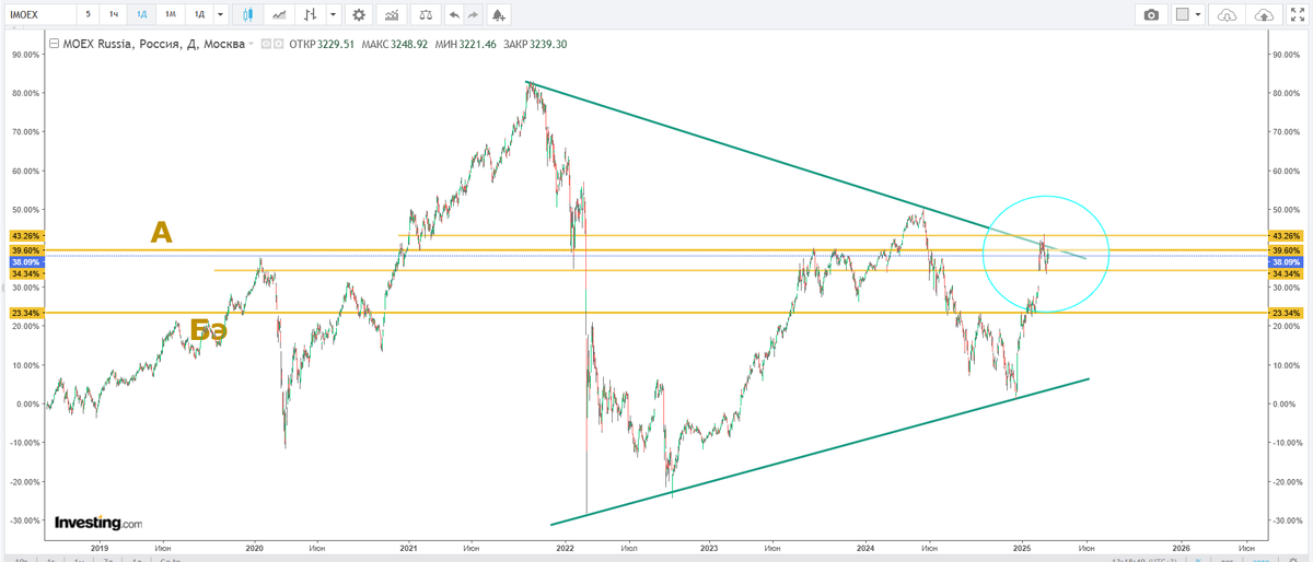 "Большое видится на расстоянии"ц, старинн. якутск. мудр. За последние 5-6 лет наш родной IMOEX сделал 2 пребольшие волны и, по законам жанра, должен прямо сейчас решать, куда выходить из супертреугольника. По фундаменталу положено, конечно, вверх, но это же - фундаментал, вещь/метод, конечно, ненадёжная. Прямо сейчас IMOEX вошёл в довольно тяжёлые для мореплавания воды, где сошлось несколько неслабых/ранее подтверждённых уровней и верхняя граница супертреугольника. Ну вот нисколько не удивлюсь, если Мамба застрянет в этом болоте до лета. Теоретически, без посторонних возмущений, волновой процесс должен был бы затухать около середины, в нашем случае в области горизонтального уровня "Бэ" - 2.900. Хм, на бирже бывает по всякому, но никогда - вот так. Прямо сейчас стоит вопрос: пробьет ли Мамба уровень "А" - 3.300. Судя по нарастанию зелёных объемов на месячных свечах - должна пробить. Но на дневных свечах роста объемов, даже просто явного преобладания зелёных объёмов - не видно..... Пока