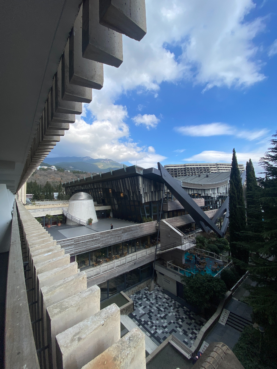 Почти все уголки территории отеля «Ялта-Интурист» я вам показала, остался пляж. Туда сегодня и отправимся. По дороге вышла на балкон, сфотографировала ресторан «Мраморный». Пляж расположен внизу под скалой, и чтобы попасть к нему, нужно сначала дойти до павильона у смотровой площадки, там расположены три лифта вместимостью до двадцати человек. На фото ниже павильон, где располагаются лифты, а рядом кафе и смотровая площадка. Внутри павильона греются коты. Лифты, к сожалению, не сфотографировала. Спускаемся на лифте и оказываемся в тоннеле, ведущем к морю. По дороге можно полюбоваться старыми фото Крыма. Далее спускаемся по лестнице. И мы на набережной пляжа. Пляж делится на несколько секторов и уровней. Места довольно много. Интересно, как тут обстоят дела летом? На среднем уровне расположены кафе и рестораны. Ресторан «Синее море». В нем можно отведать морепродукты. Ресторан «Чача», кавказская кухня. Мы на пляже несколько раз посещали кафе с крымско-татарской кухней "Селям Алейкум".