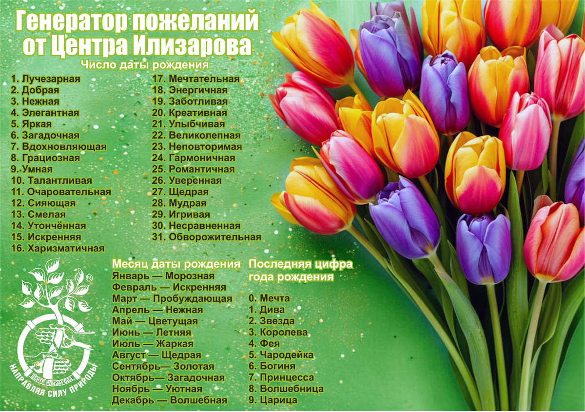 🌸 Дорогие подписчицы, мы приготовили для вас небольшой сюрприз! Хотите узнать, какое волшебное сочетание слов описывает именно вас?🌸 ✨ Как это работает: - Возьмите день своего рождения — это будет ваше первая характеристика. - Посмотрите на месяц — это второе описание. - Найдите последнюю цифру года рождения — это ваше проявление. - Сложите всё вместе — и получите своё уникальное описание! 🌷🌷🌷ВНИМАНИЕ МУЖЧИН! Наш генератор пожеланий поможет вам составить поздравление женщинам, если вы не успели придумать, потому что стояли в очереди за цветами