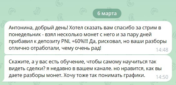 Как же приятно получать ваши отзывы ❤️ А еще приятнее, что то, что я делаю, помогает вам зарабатывать! 💵 Но с повышенным риском давайте аккуратнее, лучше меньше, но стабильно, чем сегодня много, а завтра ничего... В личке ответила про доступное обучение, давайте и тут для всех напишу, что сейчас доступно. На данный момент я выстраиваю уникальную блоковую систему обучения трейдингу - программа с планами по обучению на 2025 год тут. Где каждый может найти нужную полезную информацию и взять именно то, что вам нужно в данный момент. Основная часть уже в доступе и вы можете присоединиться к изучению 👇👇👇 Если вы только начинаете свой путь в мире криптовалют и чувствуете себя потерянным в море информации, наш курс — это именно то, что вам нужно! Программа курса специально проработана для новичков, чтобы помочь вам с нуля освоить основы крипто трейдинга и уверенно делать первые шаги в этой захватывающей области. База и must have для каждого трейдера. Изучаем самые важные и основные инс