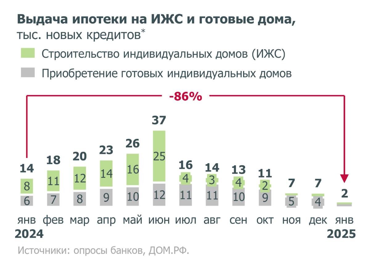 Статистика демонстрирует резкое падение объемов кредитования вслед за прекращением программы массовой господдержки. Первый месяц 2025 года показал минимальные значения за всю историю наблюдений — финансовые организации одобрили лишь 2 000 займов. Это означает сокращение на 86% относительно аналогичного периода 2024г., что подтверждает значительное влияние изменений в процентной политике. Согласно ранее озвученным планам, в текущем году предполагается построить не менее 100 млн.м2 жилья, где львиная доля придется на частный сектор (ИЖС). Однако механизмы реализации этой амбициозной цели остаются под вопросом. Для сравнения: в 2024г. достигнут исторический максимум ввода ИЖС — 62 млн.м2, что превышает показатели доковидного 2019г. в 1,6 раза. Эксперты обращают внимание на дисбаланс между растущими планами и отсутствием прозрачной стратегии их выполнения — факторы, которые должны обеспечить запланированный рост, официально не раскрыты. В данном контексте все обходят стороной качество возв