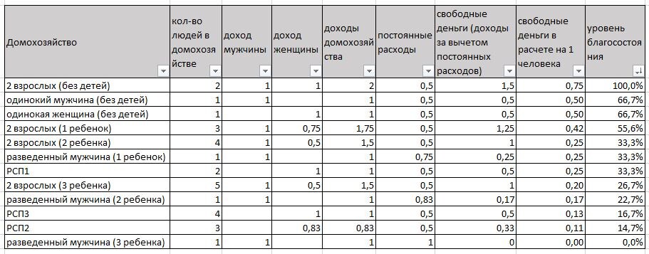За 100% благосостояния принимается благосостояние семейной пары без детей, остальное отсчитывается от этого уровня.