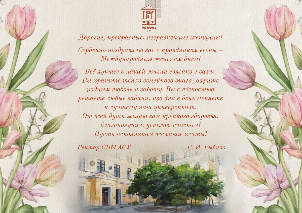 Дорогие, прекрасные, несравненные женщины! Сердечно поздравляю вас с праздником весны – Международным женским днём! Всё лучшее в нашей жизни связано с вами. Вы храните тепло семейного очага, дарите родным любовь и заботу. Вы с лёгкостью решаете любые задачи, изо дня в день меняете к лучшему наш университет. От всей души желаю вам крепкого здоровья, благополучия, успехов, счастья! Пусть исполнятся все ваши мечты! Ректор СПбГАСУ Е. И. Рыбнов