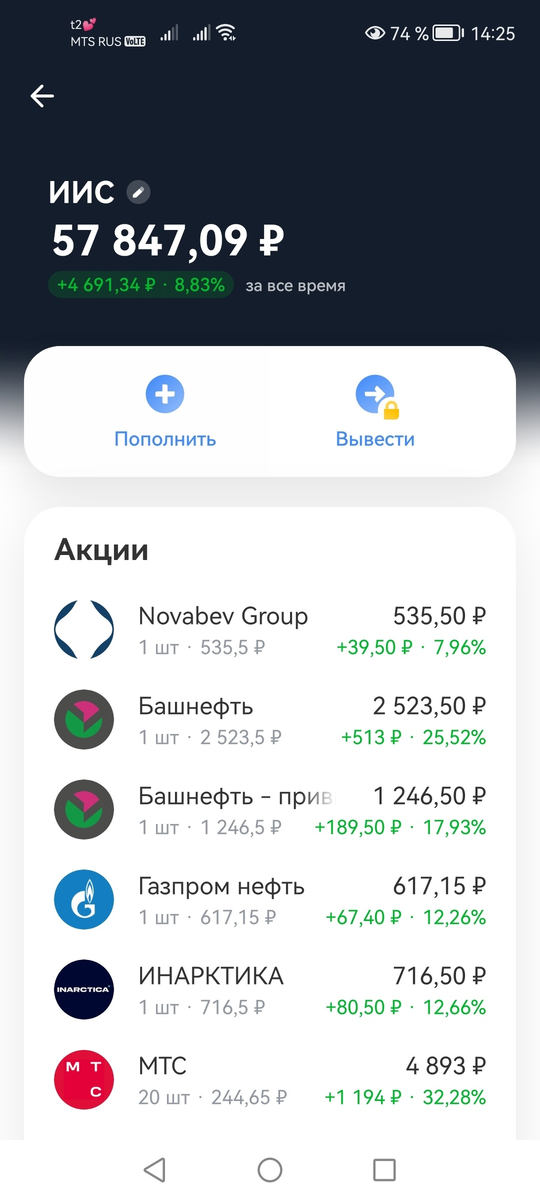 На самом деле так ведь и знал что стоит только отойти в сторону от регулярности и самодисциплины - и сразу же нарушится стройный ход моего инвестиционного замысла. И так в принципе и случилось. Притом реально то все даже неплохо, как-нибудь опубликую весь портфель, а пока так: Все худо-бедно в плюсе, это с учетом того, что я газпромчик продал. А купил облигаций, но они сюда не влезли. Ну и странно он как-то считает. По моим подсчетам я внес 50 тысяч. А сейчас - 57. А в плюсе - 4600. Странно в общем считает. Но я не то чтобы сильно против. И да, теперь я думаю что акции начнут стремительно расти. Ну Трамп и всё такое. Так что подкоплю и попробую через недельку еще закупиться хотя бы на пять тысяч рублей. Или даже больше. Вообще, конечно, очень хочется довести до 100, желательно до лета. Потому что летом еще больше вырастет. Ну да ладно. Поглядим. А пока - так. Пока я могу уверенно сказать что не жалею о том, что полгода назад решил влезть в эту тему. Уже бы ведь пропало бы всё это десят