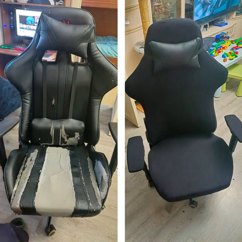 Игровые кресла дорогие, а их обивка быстро изнашивается от ежедневных марафонов в играх. Пот, пятна от чипсов, следы от кофе — знакомо? Замена кресла влетит в копеечку, но есть лайфхак: чехол за 5% от его стоимости скроет все дефекты и защитит обивку. Что ты получишь: