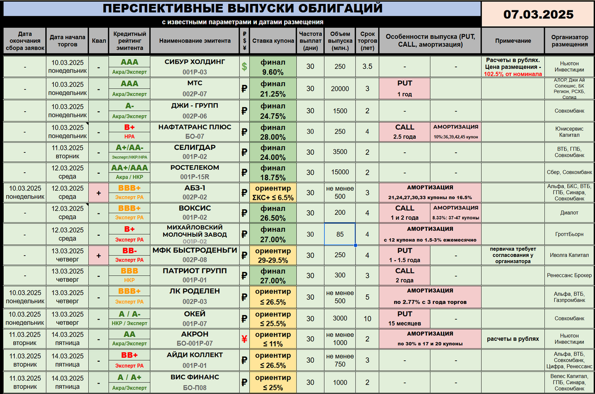 😉 В этом пятничном посте все тайное станет явным, друзья! Особенно относительно долгового рынка :) ---------- 🆕 НОВЫЕ РАЗМЕЩЕНИЯ / АНОНСЫ: 🌷 МИХАЙЛОВСКИЙ МОЛОЧНЫЙ ЗАВОД (🅱️➕) планирует разместить второй выпуск 001Р-02 12 марта. 85 миллионов рублей занимает эмитент на 4 года без оферт. Однако со второго года обращения предусмотрена амортизация по 1,5-3% в зависимости от времени года, бизнесу присуща сезонность. Купоны ежемесячные, ставка - 27% и является финальной. Начало торгов - 12 марта, организатор - ГроттБьёрн. 🌷 ДЕЛОПОРТС (🅰️🅰️ / 🅰️🅰️➖) раскрывает даты размещения и предварительный купон выпуска 001Р-04. Достаточно унылая картина: не менее 10 миллиардов рублей, 1,5 года торгов без оферт, ориентир ежемесячного купона не выше 23%. Сбор заявок - 18 марта, начало торгов уже 20-го. Организаторов вагон: Альфа, ВТБ, ГПБ, МКБ, Сбер, Совкомбанк. Вот и делите, ребята, между собой :) 🌷 БИННОФАРМ ГРУПП (🅰️) собирается за добавкой после недавнего размещения выпуска 001Р-04. Вст