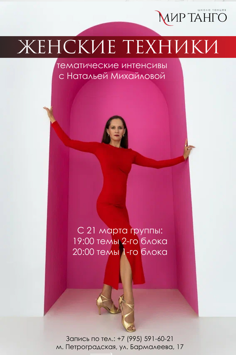 Женские техники в «Мир Танго» 🔥 Первый поток подходит к завершению, и мы запускаем сразу два потока: 🕖 19:00 – продолжение для тех, кто уже прошел первую тему и хочет двигаться дальше❤️ 🕗 20:00 – первая тема для новеньких, кто не успел попасть к нам раньше Следующий старт занятий – с 21 марта! 📍 Формат: ✔ Мини-группа до 6 человек ✔ Каждая тема – 4 занятия, системный подход ✔ Рекомендуется посещать все занятия блока 💰 Стоимость: ▫ Разовое занятие – 1100₽ ▫ Абонемент на 4 занятия – 4000₽ Количество мест ограничено! Запись:+7 995 591-60-21 (WhatsApp, Телеграмм)