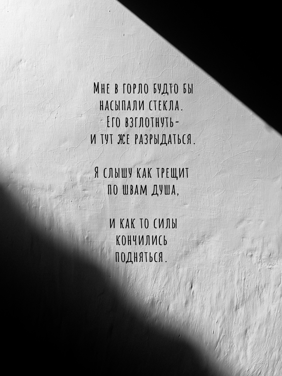 Я заперт в своих мыслях в темноте, мне тяжело дышать и нужен воздух. Веду бои на внутренней войне с самим собой. Спасать себя не поздно? Мне в горло будто бы насыпали стекла. Его взглотнуть- и тут же разрыдаться. Я слышу как трещит по швам душа, и как то силы кончились подняться. В груди тугой расплавленный металл огнем мне рёбра спешно выжигает. Так ощущается нутро твоё тогда, когда кого-то навсегда уже теряешь. Малёнкина Эн #цитаты #цитата #мысли #жизнь #литература #стихи #поэтесса #МалёнкинаЭн