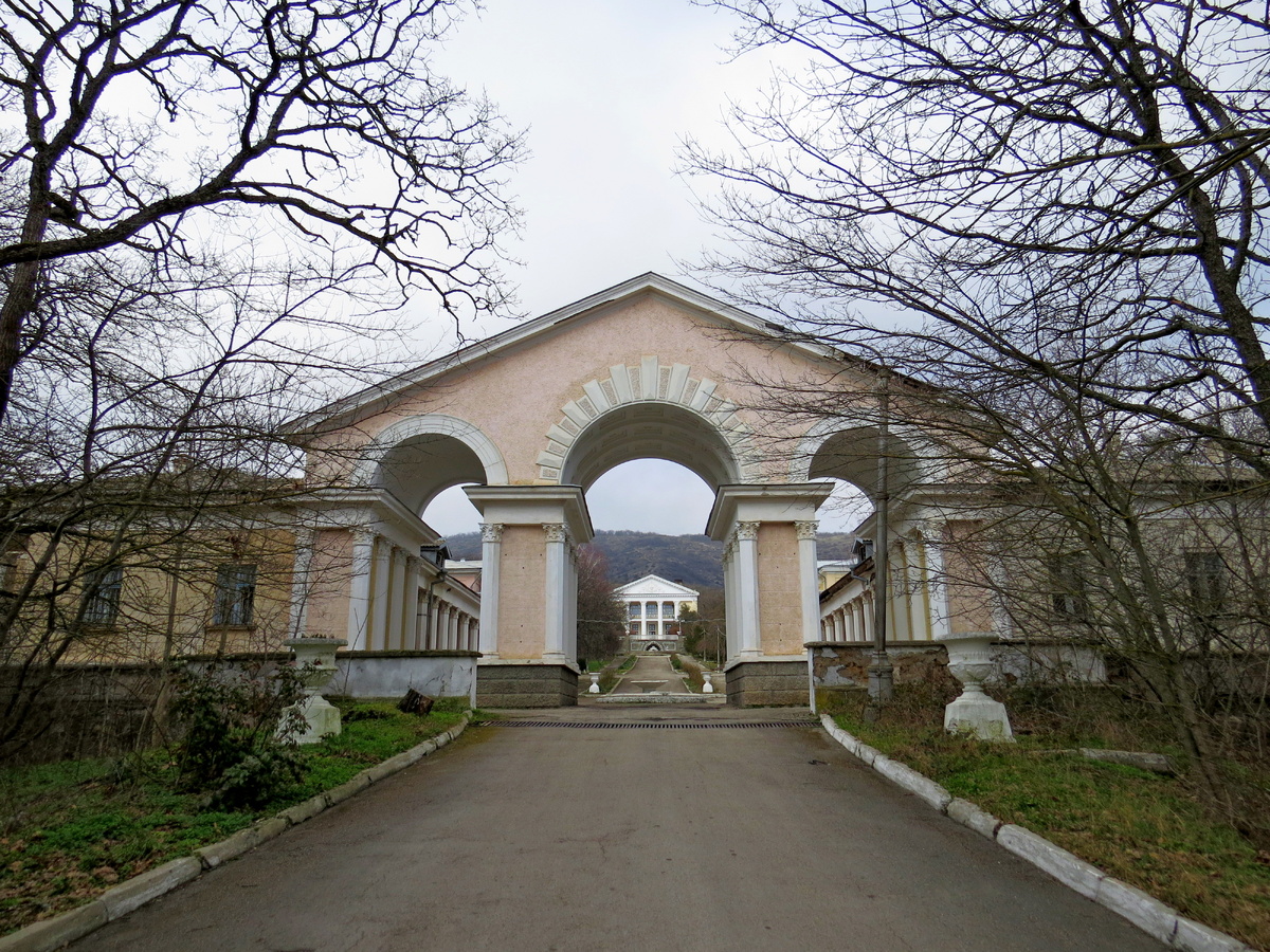 Санаторий " Старый Крым" был разрушен в годы войны 1941-1945 гг. Но был быстро восстановлен, и уже с 27 июля 1946 голу здесь была открыта база отдыха. В 1950 году санаторий снова становится Противотуберкулезным. В 1955 году было закончено строительство корпусов по оригинальному проекту, в стиле сталинской архитектуры. Таким он дошел и до наших дней. Ну что, пойдем туда, где остановилось время! Вот это Главный вход! Хочется его назвать Триумфальной аркой! Вот это монументальность! Проходя под этой мощью, ощущаешь себя маленькой букашечкой. Уже можно просто остаться здесь и рассматривать это П-образное здание с небольшим бассейном посреди двора. Так и представляются красные рыбки, плавающие в прозрачной воде и кувшинки. И почему-то именно розовые! Но, впереди манят другие корпуса. Идем по алле дальше. По бокам спальные корпуса. Какие высокие этажи! Какие огромные балконы - лоджии! Сюда в свое время, приезжали на лечение известные русские писатели Александр Грин и Андрей Белый, поэт