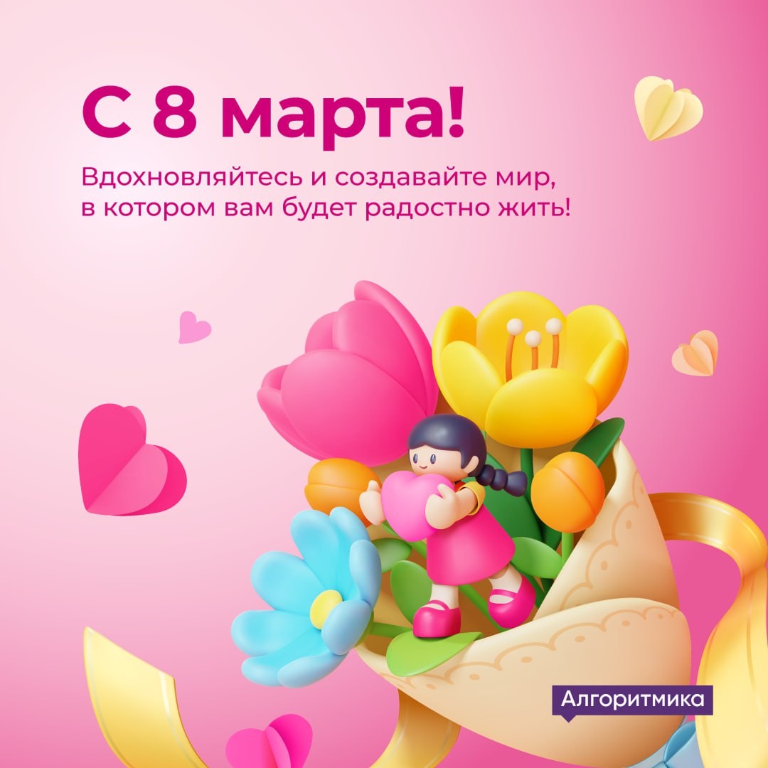 Развивая свои школы программирования Алгоритмика, вы вносите огромный вклад в будущее наших детей, делаете его более технологичным, прогрессивным и успешным. Ваша активность, решительность и профессионализм вдохновляют тысячи людей по всей стране💗 🌱 В этот весенний день желаем вам новых идей, ярких достижений и неиссякаемого вдохновения! Успешные, креативные и целеустремленные – вы настоящие героини современного мира! С 8 Марта! 💐