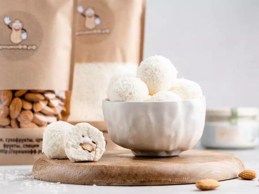 - Обваливаем конфеты в оставшейся кокосовой стружке.