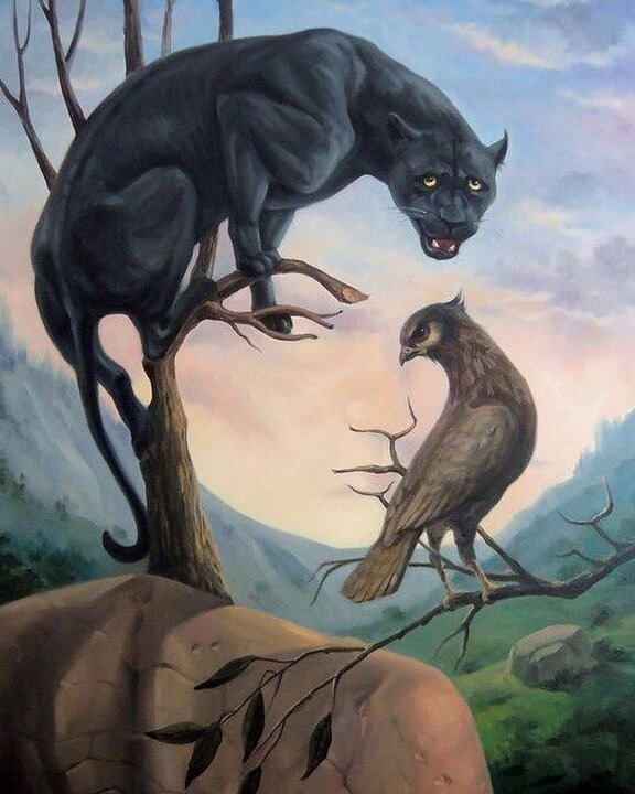 Художники рисуют удивительно красивые иллюзии-головоломки, которые и полезно разгадать, и просто полюбоваться и изумиться их фантазии. Я приготовила для вас десять самых лучших и красивых иллюзий с девушками, женщинами, девочками, матерями и женами, которые мы будем учиться разгадывать и развивать внимательность. Я часто делаю на канале тесты с такими головоломками, где надо найти скрытые объекты, посчитать лица. Многие мои читатели не могут их отыскать на картинках. Поэтому будем учиться. Полезно для любого возраста. Ответы пишу сразу. 1. Кто здесь изображен? Первая иллюзия самая простая. Считать лица и морды не будем. Просто учимся распознавать то, что хочет показать художник. Лицо девушки очерчено ветками, облаками, зрачок - лапа пантеры. В картинках, представленных ниже, тоже ищите лица в деревьях, облаках, вообще в пейзаже. 2. Найдите три лица. Здесь вам предстоит распознать трёх персонажей: двух девушек и мужчину. Обратите внимание на то, как подобные художники любят изобража