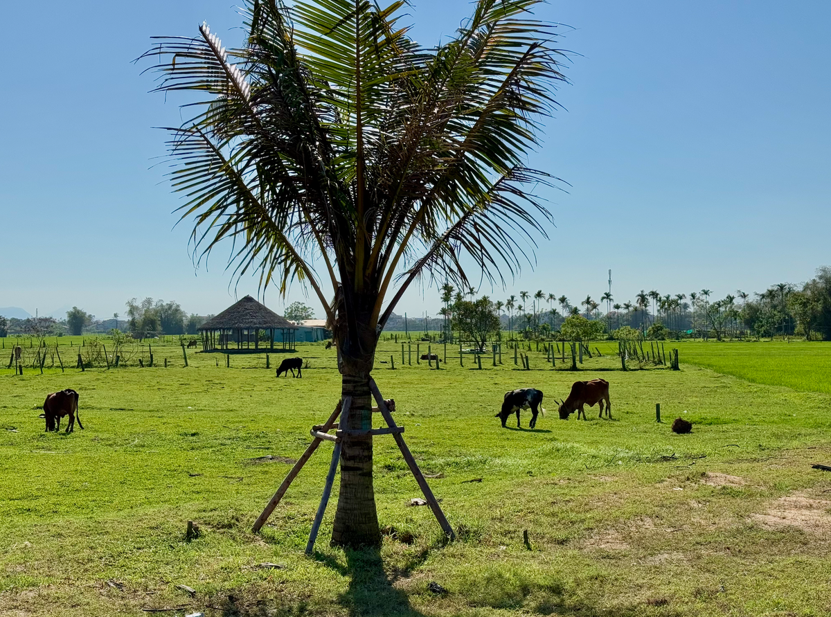 Сплав на лодках-корзинах - это обязательная часть развлекательной программы любого путешественника, приезжающего в Хойан. Это очень весело и несложно осуществить самостоятельно, без гидов и экскурсий :) По возможности, выбирайте для такой поездки солнечный день после обеда: вам не будет очень жарко, но виды заснимите фантастические! Мы выехали из Дананга в Хойан на байке. Хойан за чертой города - это бескрайние зеленые поля и коровки: Дорога очень хорошая, движение неинтенсивное. Поездка - настоящее удовольствие! Точек посадки туристов на лодки-корзины - великое множество, я выбирала по отзывам, просто "тыкая" по карте Google Maps. Едем вот сюда: Чем ближе вы будете подъезжать к точкам посадки, тем чаще будете замечать вьетнамок и вьетнамцев вдоль дорог. Они будут кричать, размахивать руками, словом, всячески привлекать внимание - это промоутеры, цель которых затащить одиноких путников к своим туристическим конторам :) Мы же всех игнорируем и едем до пункта назначения. Здесь много ра