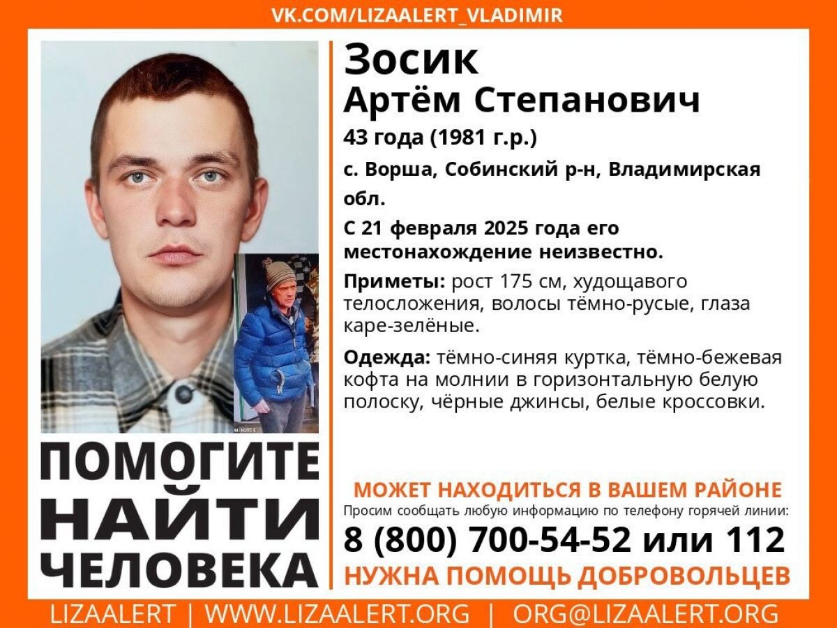 С 21 февраля 2025 года местные власти и волонтёры ищут 43-летнего Артёма Степановича Зосика из села Ворша, Собинского района Владимирской области. Мужчина пропал без вести, и его местонахождение на данный момент остаётся неизвестным. Пропавший имеет рост 175 см, худощавое телосложение, тёмно-русые волосы и каре-зелёные глаза. На момент исчезновения он был одет в тёмно-синюю куртку, тёмно-бежевая кофта с горизонтальной белой полоской, чёрные джинсы и белые кроссовки. Всех, кто имеют информацию о возможном местонахождении Артёма Зосика, просят сообщить по телефону 8-999-121-72-64. Также организаторы поисков просят сделать максимальный репост для повышения видимости розыска.