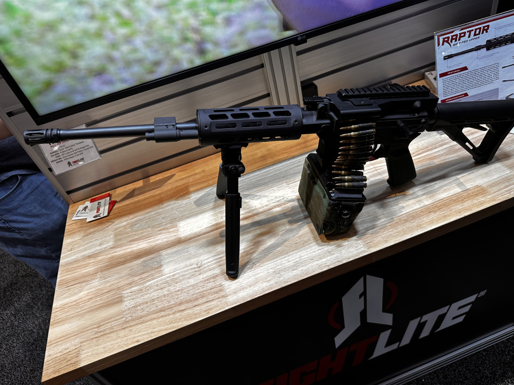 Текст Андрея Федорова Продолжая «прочесывать» поля крупнейшей в мире оружейной выставки, мы не прекращаем знакомить вас с новинками и просто яркими экспонатами. Следующим интересным образцом, о котором хотелось бы рассказать, стал пулемет Raptor от компании Fightlite. У нас уже выходил небольшой обзор на это оружие, но здесь удалось подержать его в руках и рассмотреть получше. По сути, весь пулемет — это верхний ресивер от винтовки М-4, который устанавливается вместо оригинального апера на все типы винтовок и автоматов на базе AR-15, а в магазиноприемник нижнего ресивера вместо магазина вставляется кронштейн для крепления патронной коробки. Таким образом, пулемет, наверноe, не придется таскать с собой целиком, а можно просто собрать на базе автомата одного из бойцов. Нижняя часть с УСМ, рассчитанным на автоматический огонь, без каких-либо доработок может быть использована для управления огнем пулемета. Питание производится лентой из коробки. Автоматика приводится в действие газовым пор