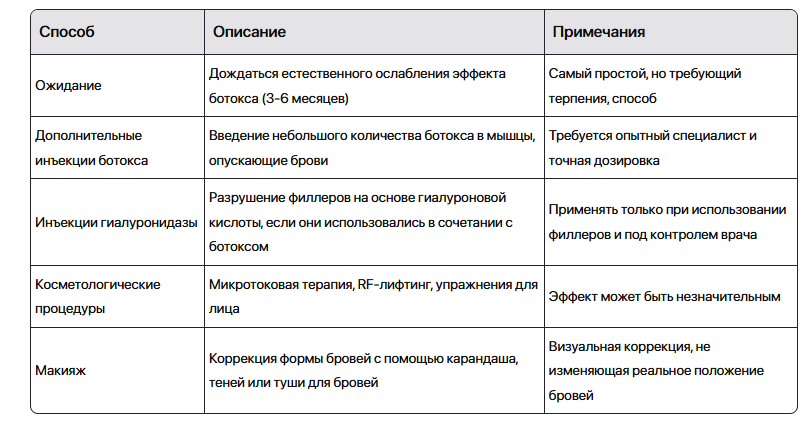 Вот таблица с кратким описанием способов коррекции бровей после ботокса: