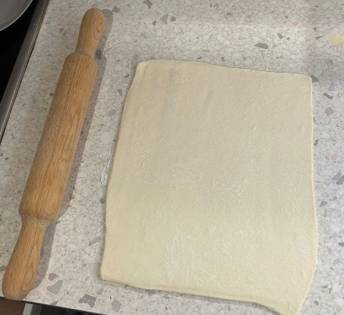 Крутая закуска без заморочек из слоёного теста. Сначала размораживаем готовое слоёное бездрожжевое тесто. У меня из двух пластов остался только один, поэтому готовлю из него. Начинкой будет бекон и сыр, поэтому, как только тесто разморозилось, раскатываем его так, чтобы листы бекона хорошо помещались на тесте. У меня получился вот такой кривоватый кусок. Выкладываем бекон по всему периметру теста. Тесто я ничем не смазывала, так как от бекона в процессе приготовления будет много жира. Далее натираем сыр не мелкой тёрке и выкладываем на бекон. У меня было немного сыра, а так можно и больше добавить, будет ещё вкуснее. Потом закручиваем рулет и нарезаем его на удобные кусочки. Выкладываем в форму для запекания или на пергамент. Из одного пласта теста у меня получилось шесть штучек. Остаётся только смазать яйцом или желтком и присыпать немного кунжутом для красоты. Ставим форму/пергамент в разогретую до 180 градусов духовку ~ на 30 минут. Закуска получается обалденно вкусной, го
