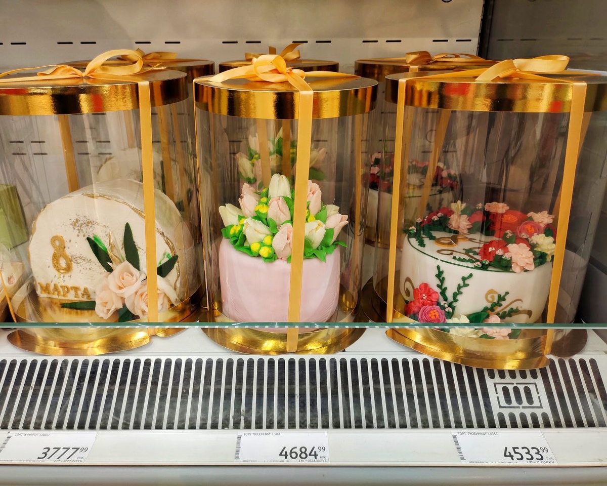 Всем привет мои дорогие! Сегодня зашла в Ашан и офигела от цен на торты. Они конечно красивые, но не настолько, чтобы стоить так дорого. Или я чего-то не понимаю? В Ашан ходят люди, которые могут себе позволить торт почти за пять тысяч? Сегодня я пришла с работы очень рано, и так как шла домой с цветами, то решила, что в магазин можно сходить и попозже, вечером. Так и сделала. Пришла домой, сделала кое-какие дела, и только потом отправилась в Ашан. Я думала народу уже не будет. Но народу было море. Кстати, перед этим я зашла в Золотое яблоко, там тоже народу немерено. Бедные консультанты все в мыле. Ведь основная публика сегодня это мужчины. А им точно нужен консультант. Конечно же, торты красивые, не спорю. Я сама замерла перед ними. Но цены! Такие цены на торты я видела раньше только в гастрономе ГУМа. Но зная наших мужчин я готова предположить, что кто-то принесет сегодня домой такой тортик. Да, дорого, но не дороже денег, как говорится. И как тут поругаешь мужа за такую растр