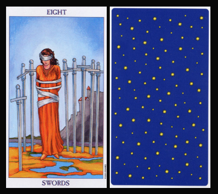 В одиночестве, несвободе, окруженный препятствиями, барьерами, условностями, запретами, с которыми я просто молча соглашусь (8 мечей), я буду размышлять над смыслом происходящего, искать ответы на философские, глубокие вопросы, копать до истины, до моей правды, а найдя смысл, причину, проработав план действий, я закрою старую историю, полностью сменю тактику, подход, способы, начну заново, освободившись от страхов, предрассудков, запретов и сомнений (Шут).