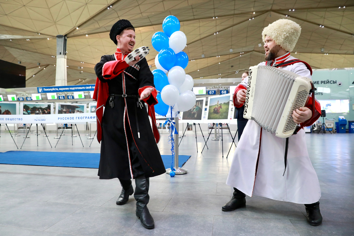 В терминале открылась уникальная фотовыставка «Старинная казачья свадьба на Дону». Реконструкция обряда конца XIX – начала XX века подготовлена совместно с Русским географическим обществом. Торжественное открытие украсило выступление солистов ансамбля «Казачья Доля». Фотопроект Марии Астаховой воссоздаёт каждый этап традиционного торжества — от первых «смотрин» до «хождения по сабе». В его основу легли работы этнографа и фольклориста А. М. Листопадова. Это первая выставка в серии совместных проектов с РГО о культуре, природе и традициях народов России.