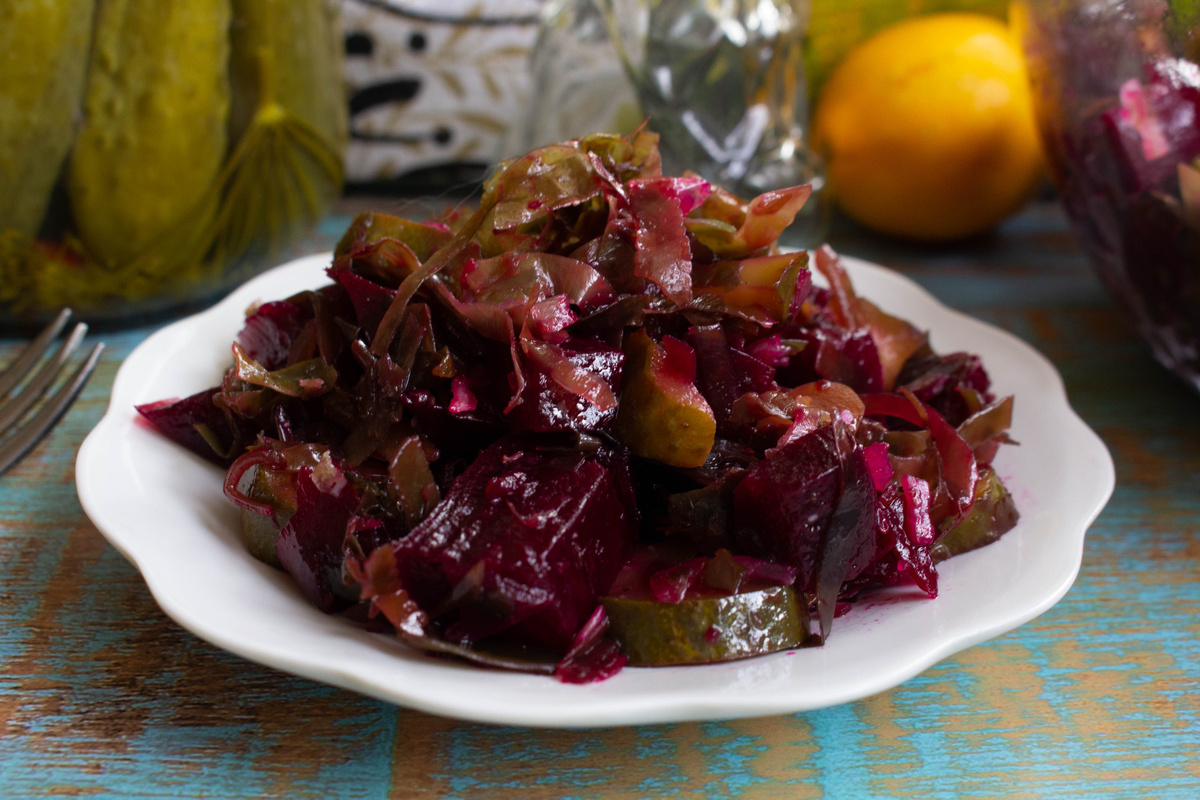 Не всем, сразу скажу, не всем понравится этот салат. Тут и свекла, морская капуста, не все любят эти продукты. Салат необычный по вкусу. Салат сочный, легкий, полезный и яркий. Я люблю и свеклу, и капусту, мне этот салат нравится. Такой салат отлично подходит для постного, вегетарианского/веганского меню и даже просто для разгрузочных дней. Количество ингредиентов можно менять, добавить больше того продукта, который вам нравится. Заправить салат можно любым растительным маслом, которое вам нравится. Свекла - 300 г. Морская капуста маринованная - 200 г. Огурцы маринованные - 3-4 шт. Масло оливковое - 1 ст.л. Сок лимонный, соль - по вкусу Свеклу сварим до мягкости, остудим и почистим. Свеклу можно не варить, а запечь в фольге, в духовке. Маринованные огурцы нарежем кружочками или кубиками. Добавим к огурцам морскую капусту. Свеклу нарежем кубиками. Заправим салат растительным масло, добавим лимонный сок по вкусу. Посолим салат по вкусу, если нужно. Перемешиваем салат. Салат можно сразу п