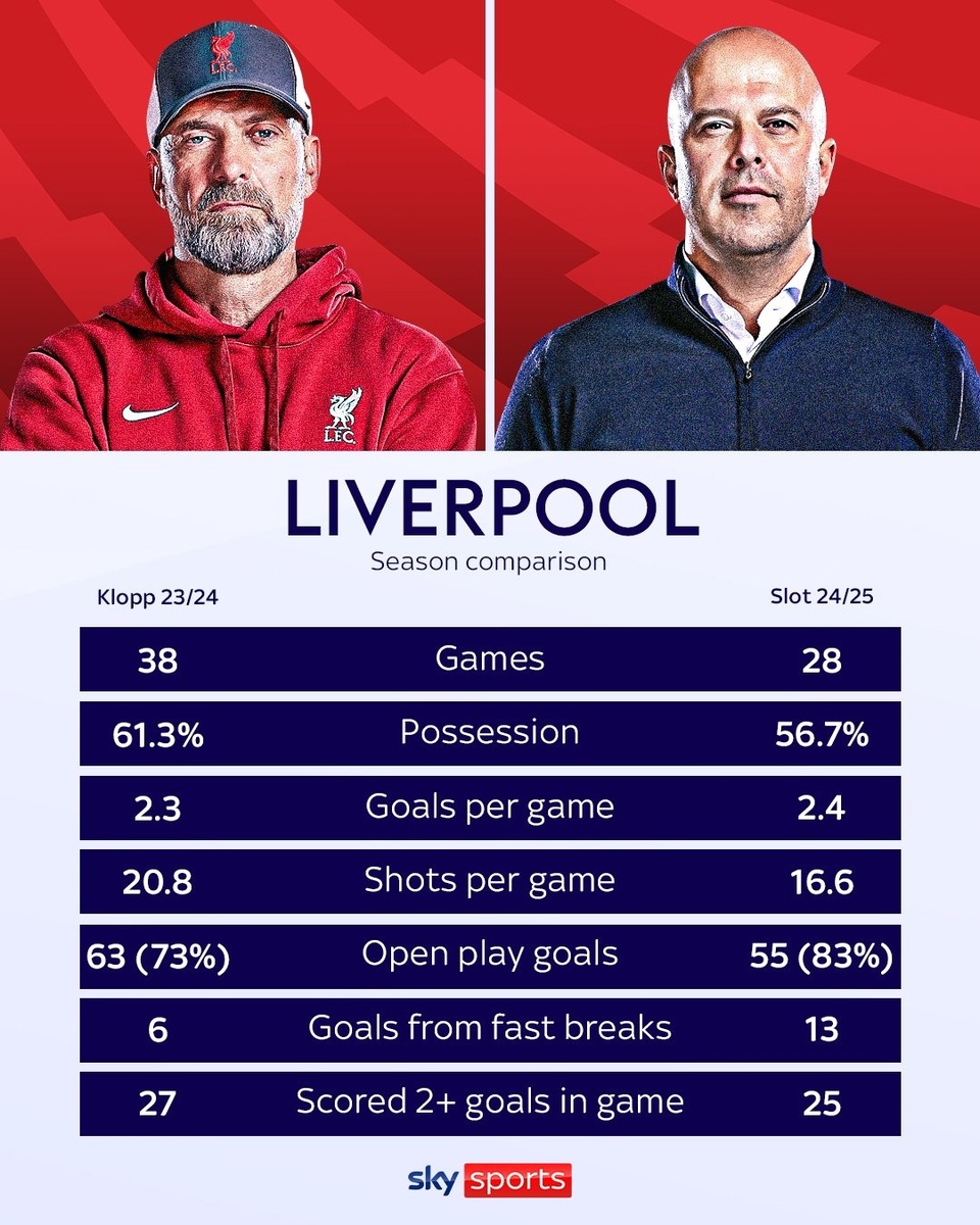 Sky Sports решил сопоставить результаты Слота с показателями Клоппа в последний сезон Юргена во главе «Ливерпуля». Эксперты сравнили следующие атакующие метрики: владение, среднее количество голов за матч, удары за матч, голы с игры, голы с контратак и матчи, в которых было забито минимум два гола.