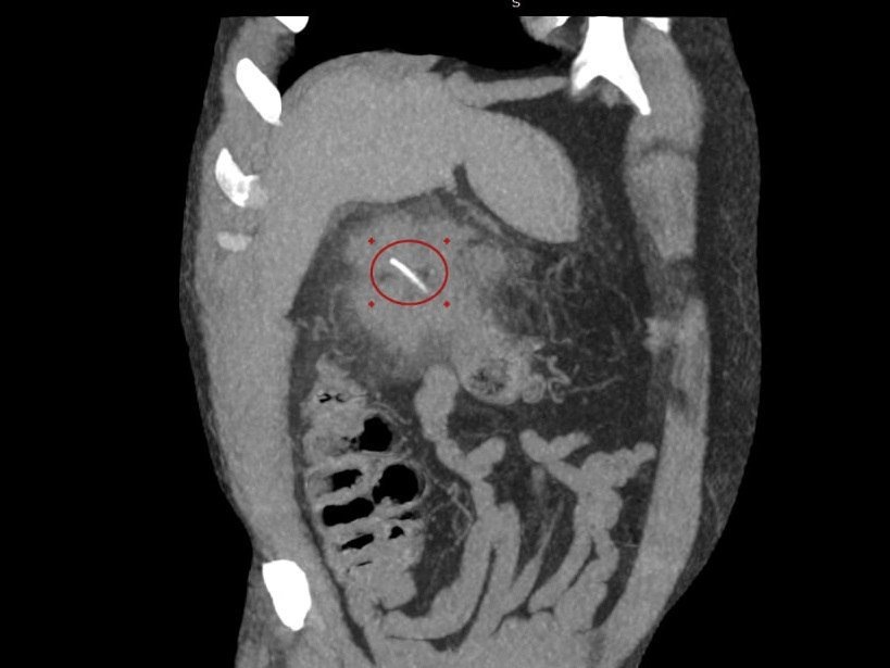 Врачи выяснили, что пациент месяц назад проглотил кость и только через некоторое время стал ощущать боли в подреберье. Но даже после этого он не стал обращаться за медпомощью.